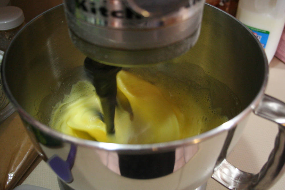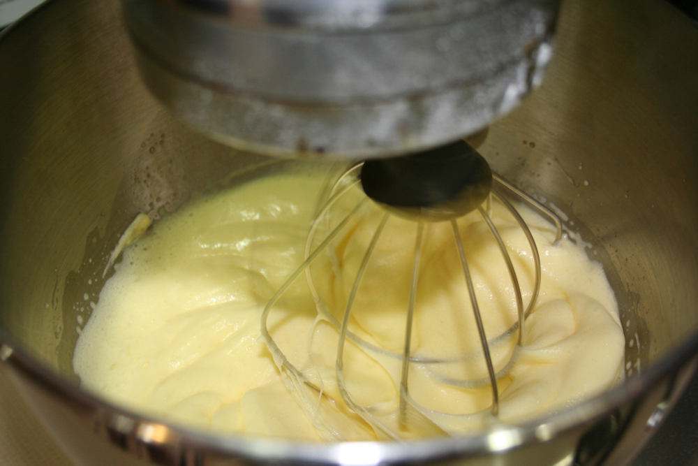 It also allowed for a little experimentation. The recipe from Confectionista called for using a hand mixer, but I am between hand mixers at the moment, so I had to decide if I should do the eggs with a paddle or a whisk. I decided to do one of each (if I’d been smart, and had remembered to look at my Mary Berry book, I wouldn’t have experimented). The clear winner for volume, as you can see in the pictures, is the whisk.