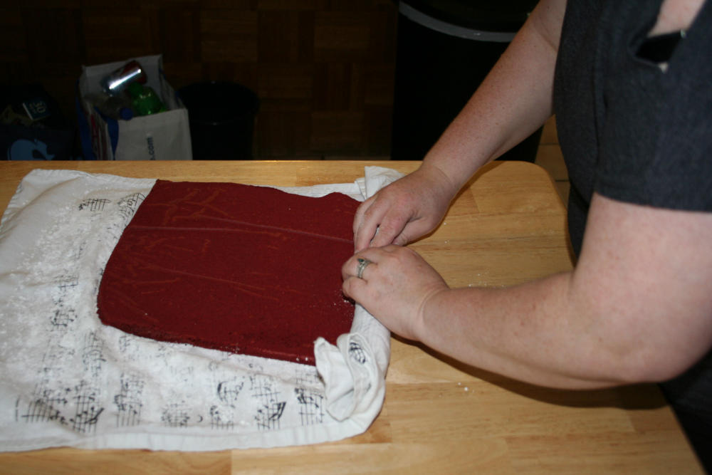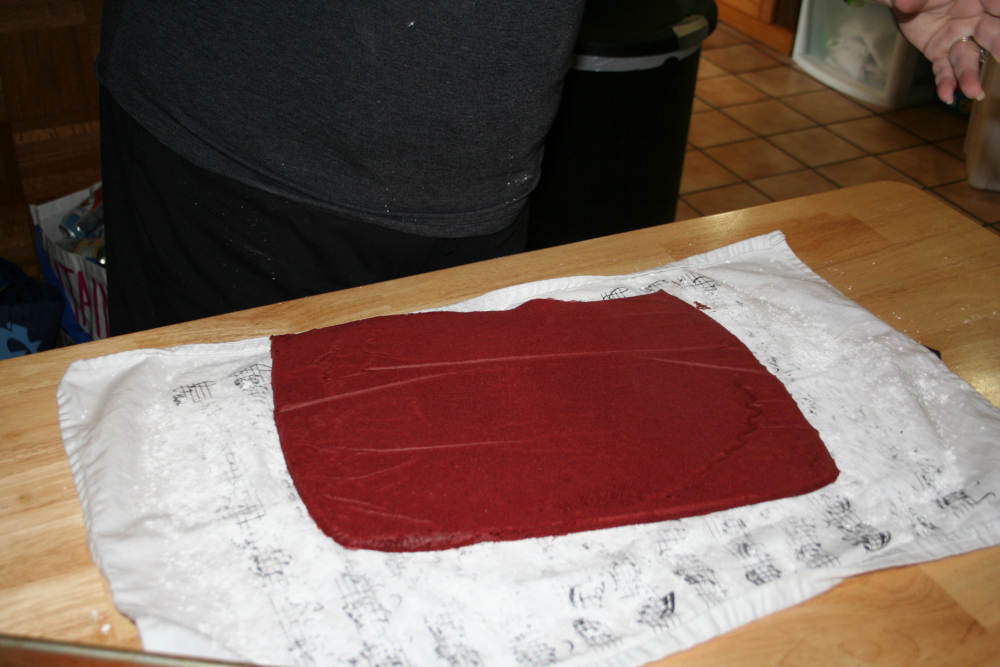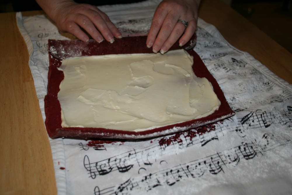 Then it was my turn. I held my breath and the pan, and I DID IT!!! with a quick flip the cake landed squarely in a full sheet on the powdered tea towel. I could breathe again! From there on out it was stress free cooling of the cakes and the making of the cream cheese frosting. We stuck with the cream cheese frosting and will try the Ermine another time. We knew our audience and were aiming to please. A comforting cream cheese frosted Red Velvet Swiss Cake Roll was in the works.