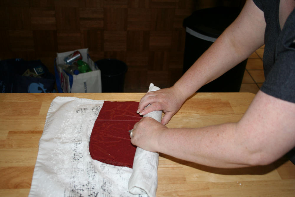 You have to do the flip/peel/roll as soon as the cake comes out of the oven, because if you don’t get it rolled while it is still very hot, it will crack or worse – not roll at all! It helps if you have “asbestos fingers” to do it, but if you don’t, the towel does provide a bit of insulation against the heat.
