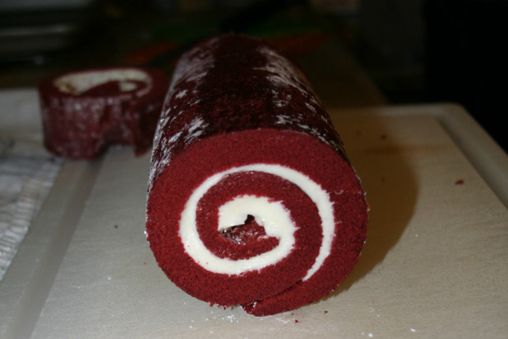 My solution was to make a Swiss cake roll, which I really only just discovered this past year after buying Mary Berry’s Baking Bible. They’re ridiculously fast to make, and relatively easy too. I had to do some research, and found a red velvet swiss cake roll recipe that seemed pretty straightforward, and had most of the ingredients I look for in my red velvet cakes. I found the recipe at Confessions of a Confectionista and ended up tweaking some of the recipe – I used maybe half of the sugar in the frosting, and I will say, and Sarah can agree or not, if I make it again I will replace the oil with melted butter. I missed that buttery yumminess that can be found in really good red velvet cake, but it was not a dealbreaker at all!
