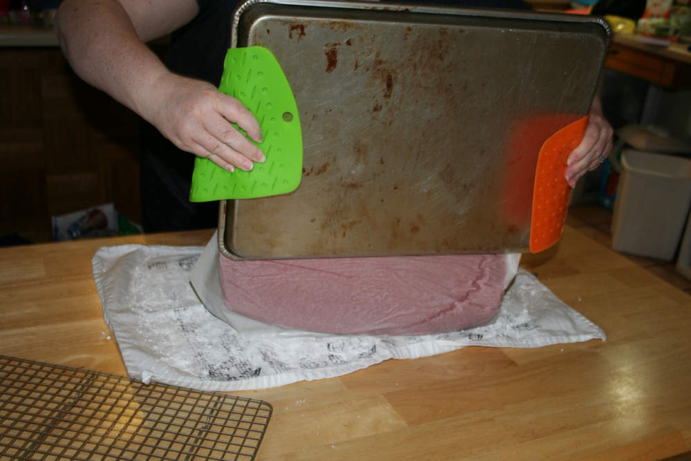 Once the cakes were baked, I had to face my fear of flipping. If it was done incorrectly or too slow, the cake would fall off of the pan and split making it useless for making a Swiss Roll at all. I let Kate do the first one. She did it effortlessly and quickly rolled it into a sugar powdered tea towel for cooling in the fridge.